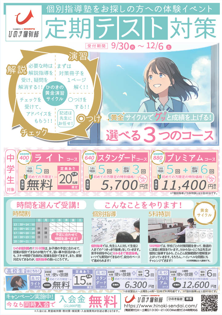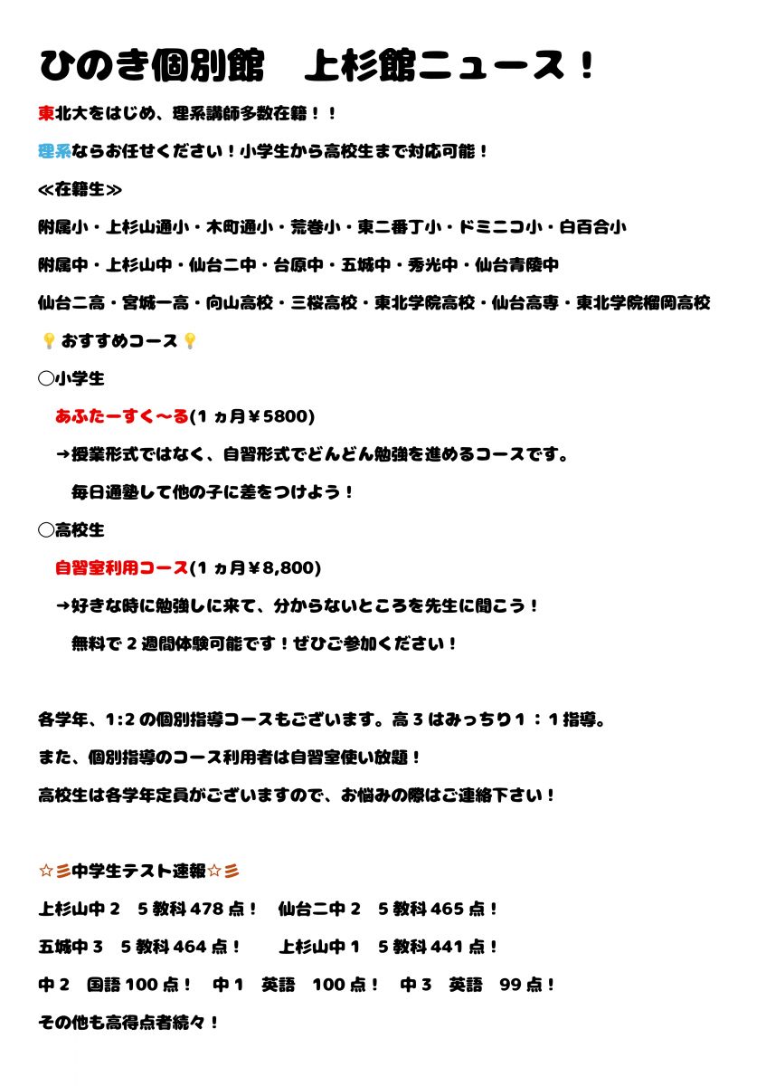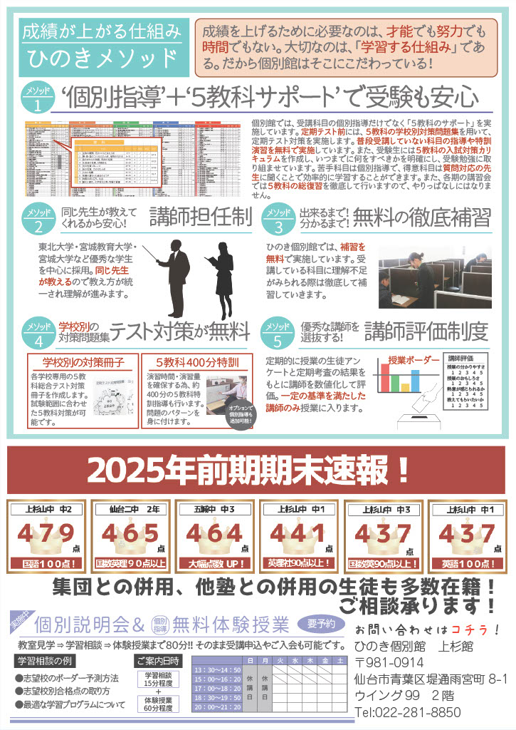 週2回の通塾の価格で5教科の指導をしていただけるので、追加費用かからず金銭面の心配もする必要がありません。上杉館は地下鉄の近くにあるので子供を通わせやすい。(台原中)
