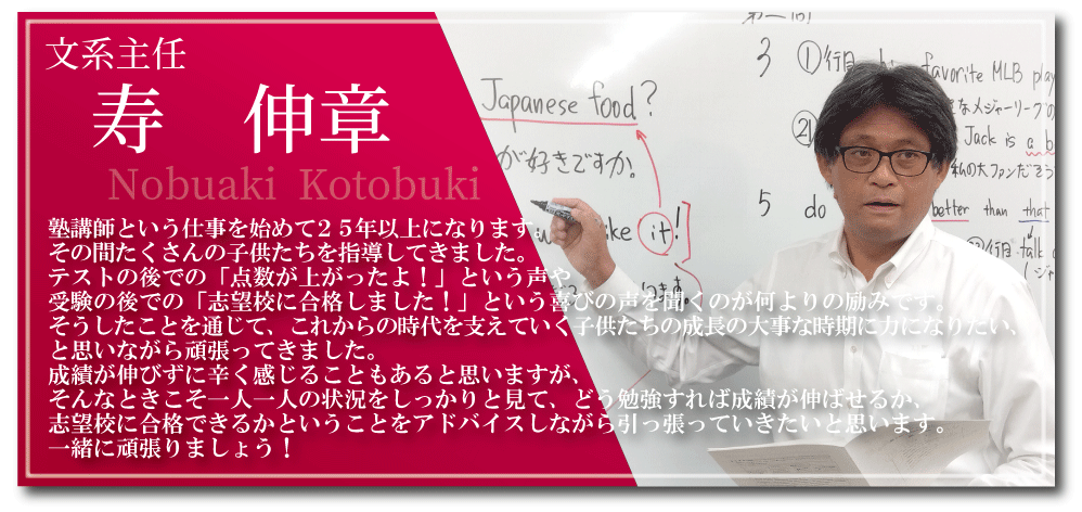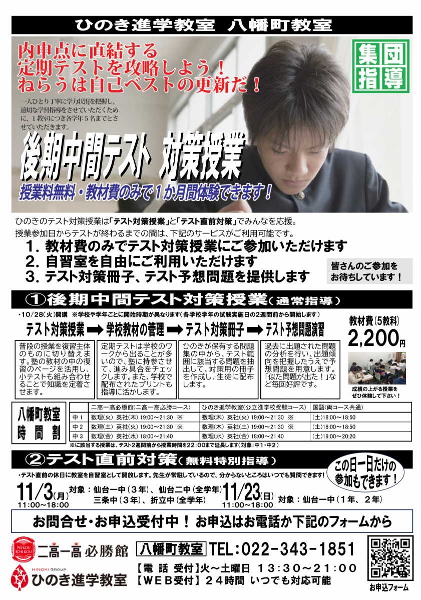 - 大崎八幡宮の近く、国道48号線沿いにある教室です。仙台一中・仙台二中の近隣中学の生徒はもちろんのこと、バス路線や保護者様のご送迎で吉成方面・折立・愛子方面からの通塾する生徒もいます。さまざまな中学校の生徒が集まり、切磋琢磨して勉強しています!