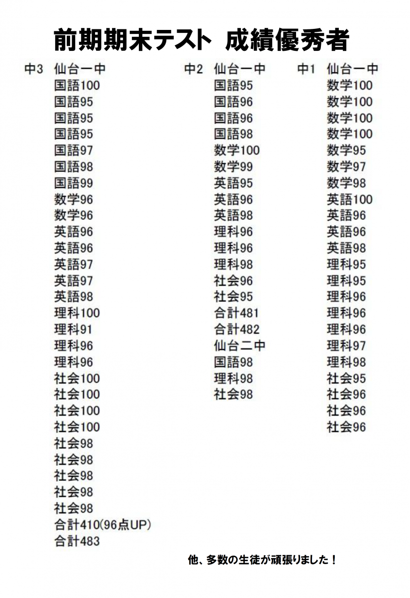 - <中学校>仙台一中/仙台二中/三条中/吉成中/南吉成中/折立中/大沢中/広瀬中 など
