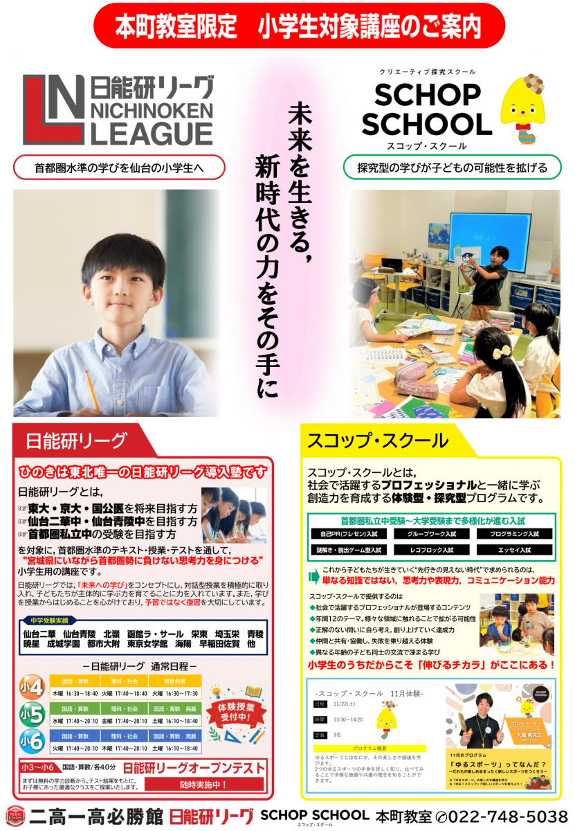 - 中学受験最大手『日能研』のNカリキュラムを用いて,“首都圏水準”の学びを提供する特別精鋭クラスです。私立中学受験に必要な内容を網羅したカリキュラムに基づき,中学受験はもちろんのこと,将来の高校受験・大学受験までを見据えた高い思考力を身につけることができます。仙台二華中受検へ向けた準備としても最適です。
