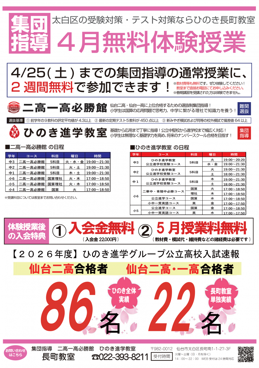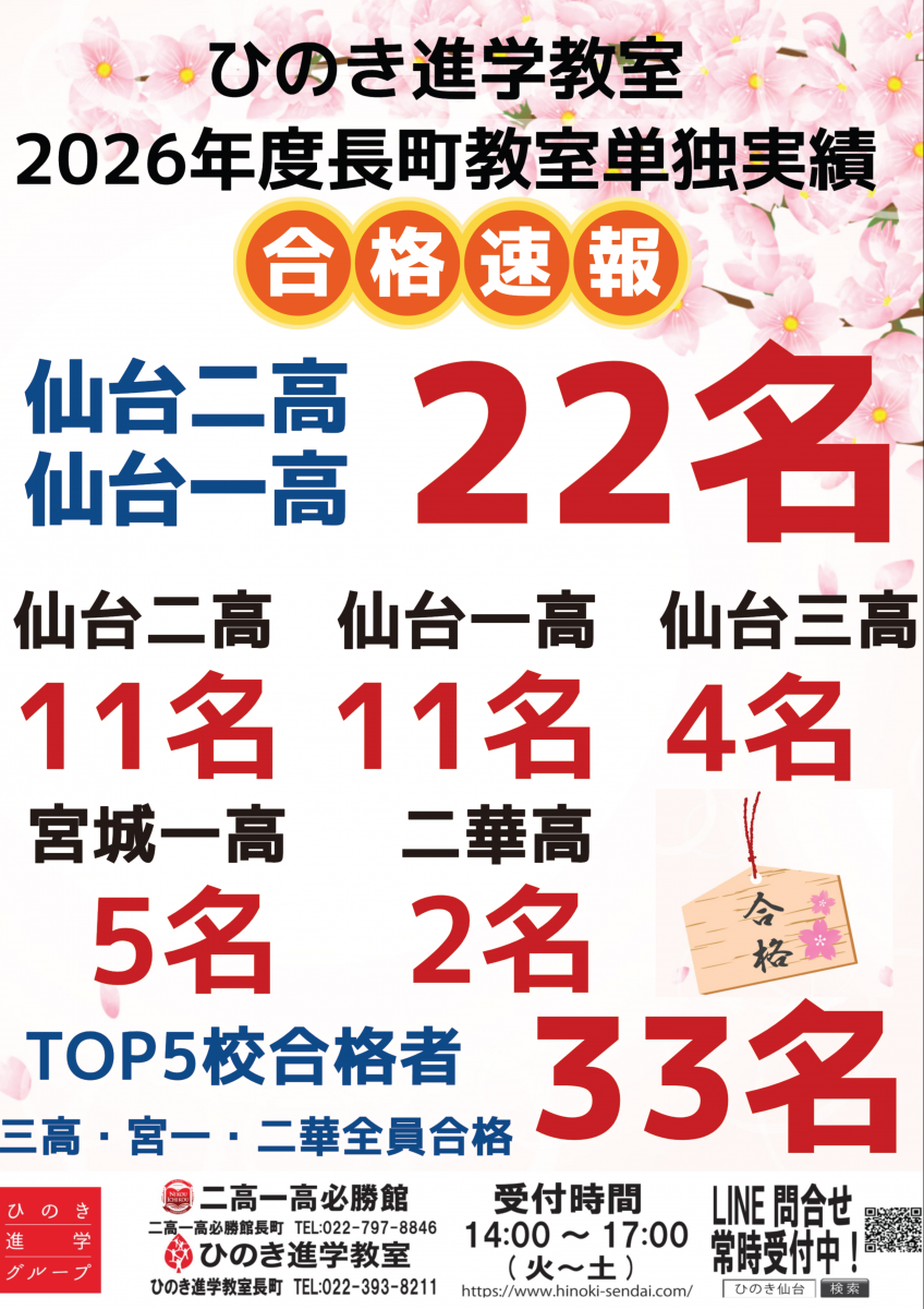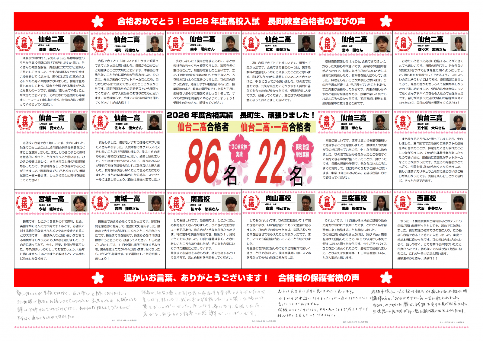 先生方の熱意のある指導のおかげで、勉強が苦手だった娘が自習室に通い、勉強をする習慣ができました。(長町小)