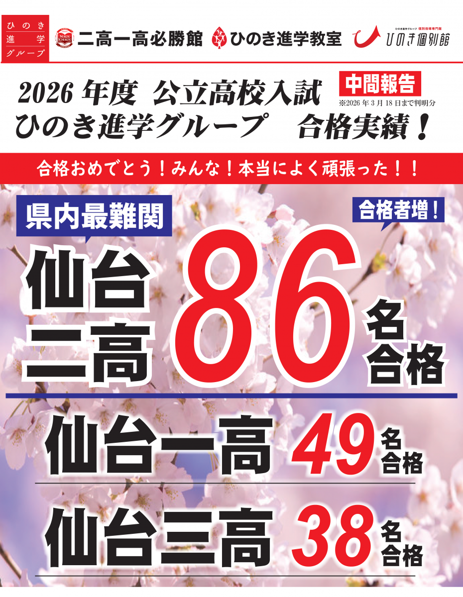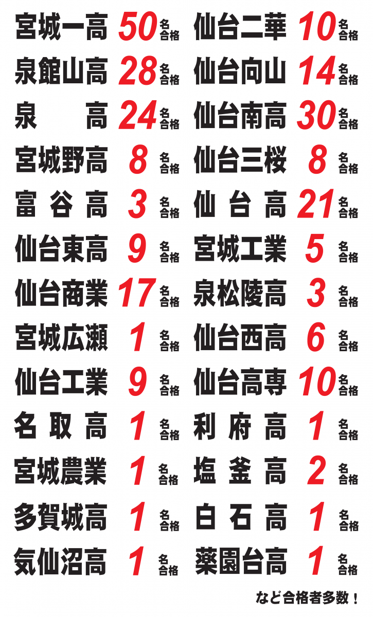 - ※記載の合格者数は、ひのき進学グループの塾生として受験学年時に在籍した生徒のみの実績です。二高一高必勝模試などの模擬試験のみを受験した模試生は一切含めておりません。